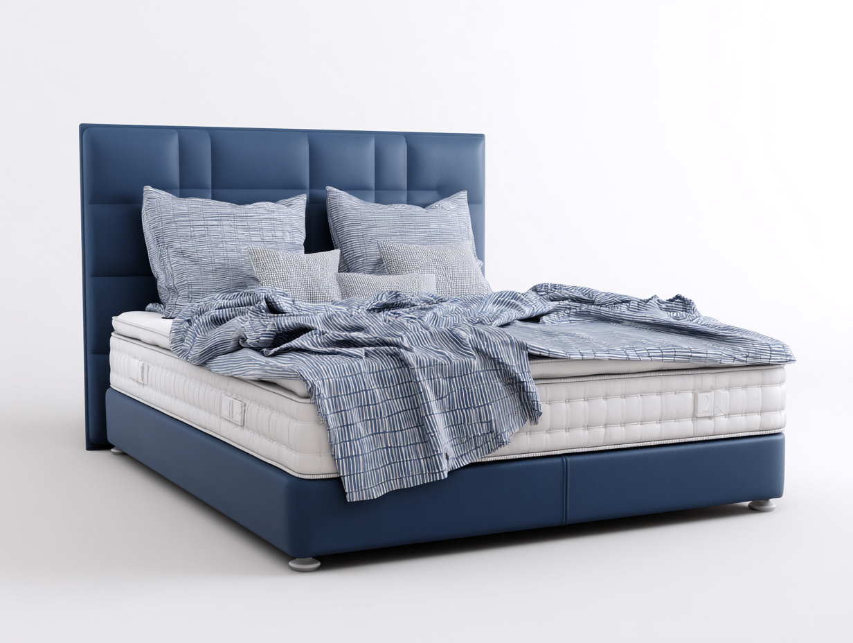 Structure tapissée en textile bleu, finitions régulières et structure stable.